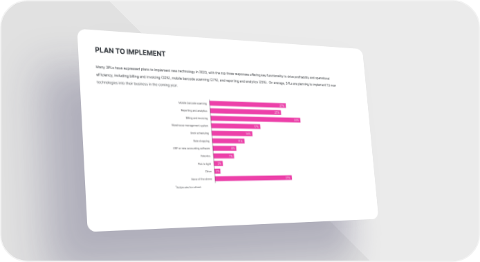 PLAN TO IMPLEMENT Many 3PLs have expressed plans to implement new technology in 2023, with the top three responses offering key functionality to drive profitability and operational efficiency, including billing and invoicing (32%), mobile barcode scanning (27%), and reporting and analytics (25%). On average, 3PLs are planning to implement 1.5 new technologies into their business in the coming year. *Multiple selections allowed.