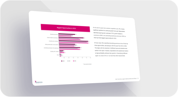 On the tail of a great new customer acquisition year, 3PLs display significant optimism for continued growth next year. Respondents identified acquiring new customers (77%), growth related to ecommerce (56%), and automating warehouse processes (53%) as their top three biggest opportunities for 2023. Of note, fewer 3PLs identified diversifying services as one of their top three opportunities, decreasing to 33% this year from 43% in 2020. This aligns with the reduction in fulfillment type and industries seen earlier in the report. However, respondents who experienced medium to high profitability attribute their growth to “diversifying fulfillment types” at a rate of 21% or 1.2x more than other reasons listed. *Three selections allowed. 2022 Third-Party Logistics Warehouse Benchmark Report | 15