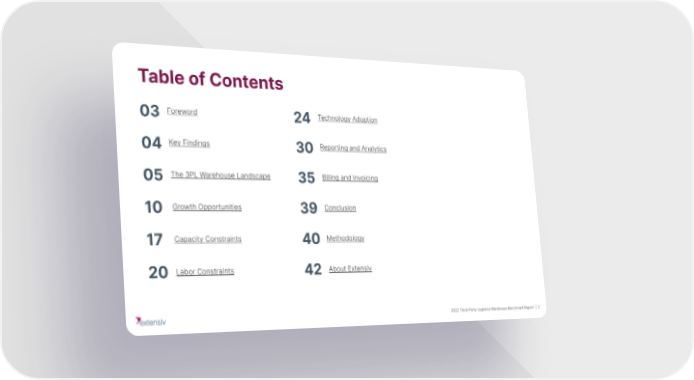 Table of Contents 03 Foreword 24 Technology Adoption 04 Key Findings 30 Reporting and Analytics 05 The 3PL Warehouse Landscape 35 Billing and Invoicing 10 Growth Opportunities 39 Conclusion 17 Capacity Constraints 40 Methodology 20 Labor Constraints 42 About Extensiv 2022 Third-Party Logistics Warehouse Benchmark Report | 2