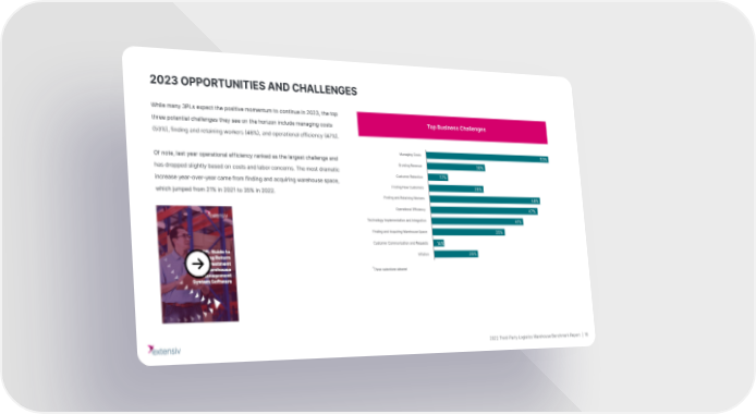 2023 OPPORTUNITIES AND CHALLENGES While many 3PLs expect the positive momentum to continue in 2023, the top three potential challenges they see on the horizon include managing costs (53%), finding and retaining workers (48%), and operational efficiency (47%). Of note, last year operational efficiency ranked as the largest challenge and has dropped slightly based on costs and labor concerns. The most dramatic increase year-over-year came from finding and acquiring warehouse space, which jumped from 21% in 2021 to 35% in 2022. *Three selections allowed. 2022 Third-Party Logistics Warehouse Benchmark Report | 16