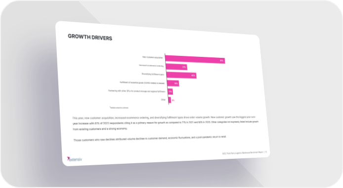 GROWTH DRIVERS *Multiple selections allowed. This year, new customer acquisition, increased ecommerce ordering, and diversifying fulfillment types drove order volume growth. New customer growth saw the biggest year-over- year increase with 81% of 2022 respondents citing it as a primary reason for growth as compared to 71% in 2021 and 66% in 2020. Other categories not expressly listed include growth from existing customers and a strong economy. Those customers who saw declines attributed volume declines to customer demand, economic fluctuations, and a post-pandemic return to retail. 2022 Third-Party Logistics Warehouse Benchmark Report | 12