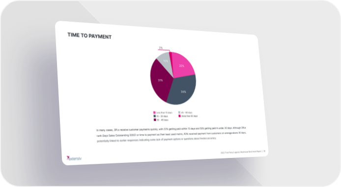 TIME TO PAYMENT In many cases, 3PLs receive customer payments quickly, with 22% getting paid within 15 days and 56% getting paid in under 30 days. Although 3PLs rank Days Sales Outstanding (DSO) or time to payment as their least used metric, 43% received payment from customers on average above 30 days, potentially linked to earlier responses indicating some lack of payment options or questions about invoice accuracy. 2022 Third-Party Logistics Warehouse Benchmark Report | 38